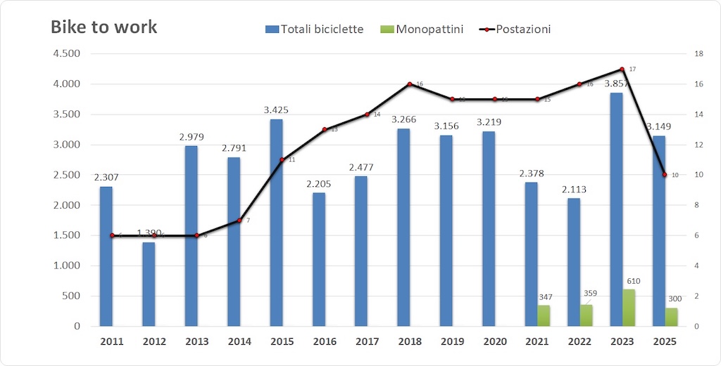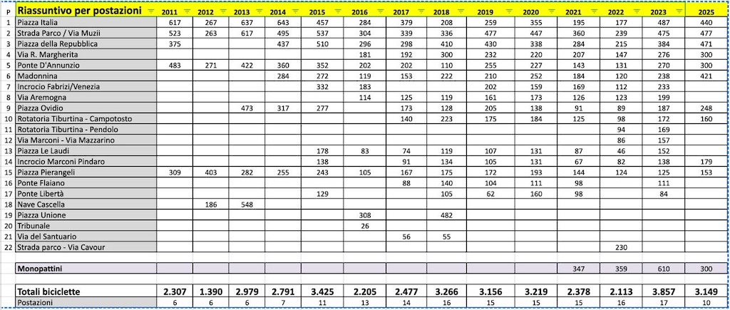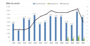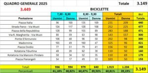 Un elemento particolarmente significativo è la media per postazione: con sole 10 postazioni attive quest’anno, si è registrato un valore di circa 315 ciclisti per punto di rilevamento, tra i più alti di sempre. Questo dimostra che le persone in bici si concentrano soprattutto lungo gli assi principali della città, come la Strada Parco, Piazza Italia, Piazza della Repubblica e la Madonnina.